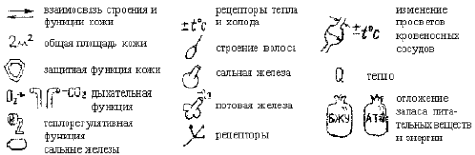 Объясняя строение кожи, учитель вычерчивает на доске цветными мелками схему опорного конспекта и обозначает на нем основные элементы кожи: эпидермис, дерму, подкожную клетчатку, сальные и потовые железы, нервные окончания и кровеносные сосуды. Функции кожи и физиологические процессы, в ней происходящие, обозначаются в конспекте сигналами, цифрами, буквами, стрелками, символами. Легкие по исполнению сигналы, такие, как “L” – обозначающие взаимосвязь строения и функции кожи; “36,6 °С” – роль кожи в поддержании постоянства температуры тела; “Q” – тепловой удар и другие, в ходе рассказа учитель рисует на доске. Наиболее трудоемкие сигналы используются готовыми, рисуются заранее на плотной бумаге.