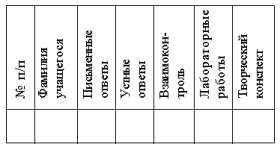 Итак, в ходе урока все учащиеся получили оценки за письменную работу и еще 10 ребят – за устные ответы. Для учета оценок в классе ведется ведомость открытого учета знаний (таблица). В нее “ассистенты” после урока заносят все оценки, полученные учащимися за устные и письменные ответы. Пятерки ставятся в ней чернилами, другие оценки – карандашом. Это значит, что учащиеся имеют право улучшить свои оценки после дополнительной проработки материала. Отсутствие оценки в ведомости говорит о том, что ученик не сдал опорный конспект и имеет задолженность.